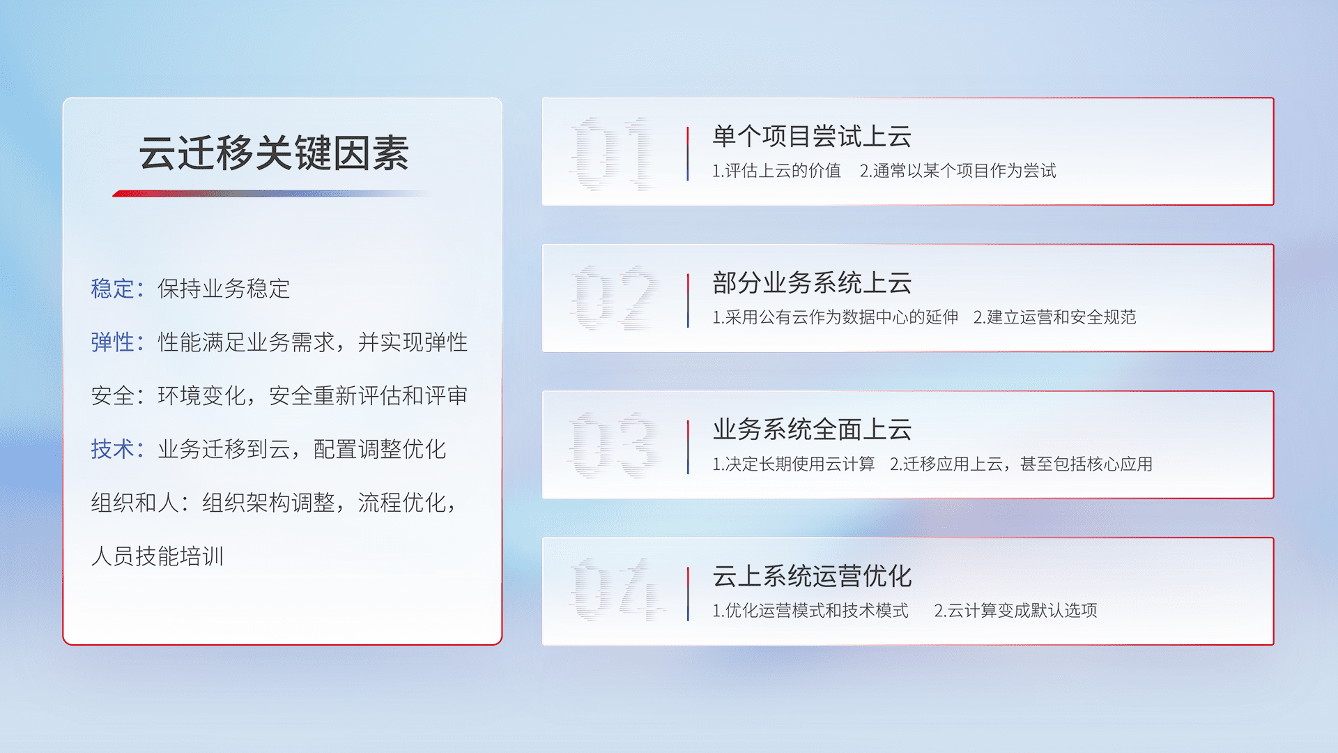结合实际业务,,从规划设计、、、云平台选型、、云原生改造、、数据迁移、、、集成交付,,,,迁移全过程为客户识别最佳上云路径,,做好风险识别管理,,设计网络架构、、身份权限、、安全审计合规、、、、操作审计、、日志审计、、、、监控告警策略、、、多站点容灾设计等,,,对云上基础设施进行整体规划,,,提升IT治理水平,,,,以满足弹性、、高可用、、高性能的需求。。
